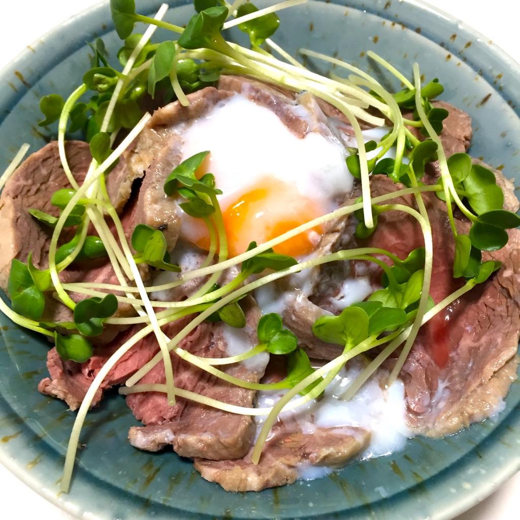 薄くスライスしたロストビーフをごはんにのせ、温泉卵とカイワレ大根をトッピング。