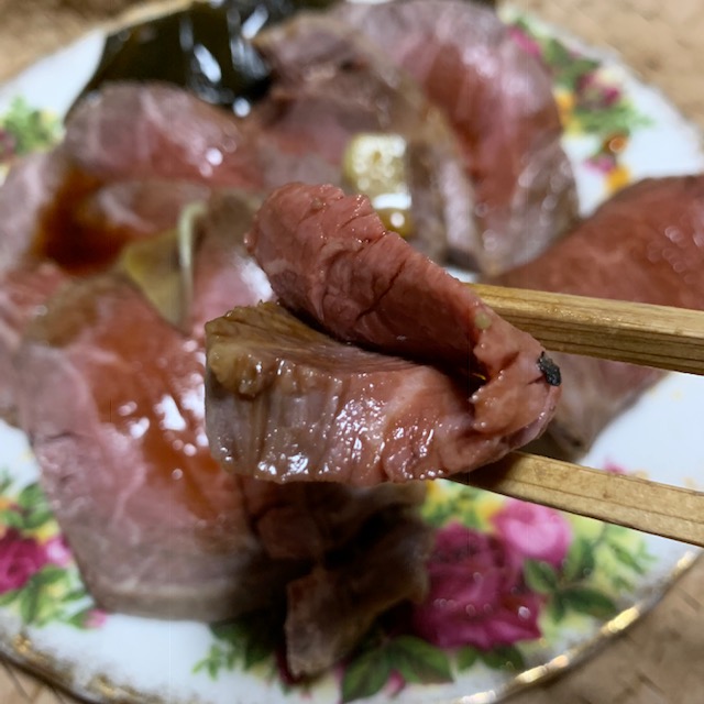 旨味成分を出すにはステーキのように焼き目をつけるしかないそうですが、こちらのローストビーフは昆布を使って旨味を浸透させて仕上げているそうです。