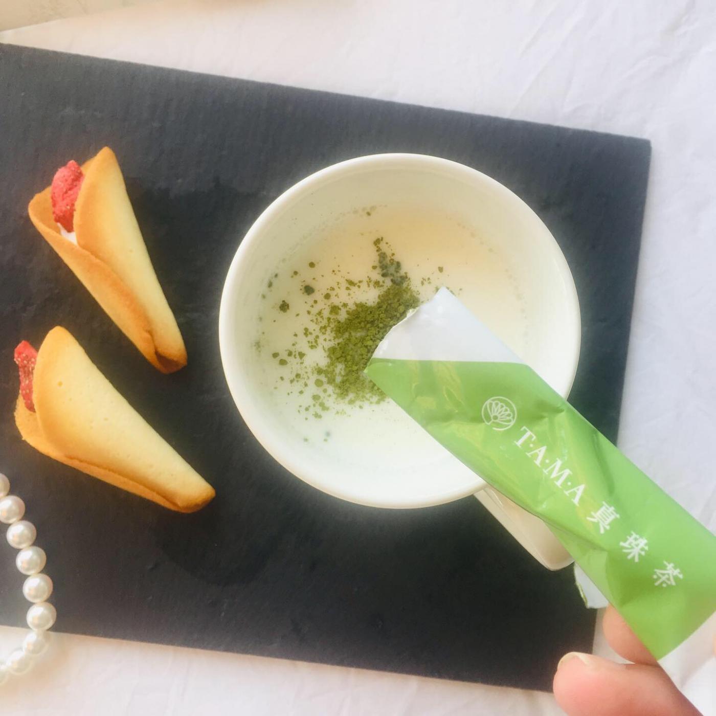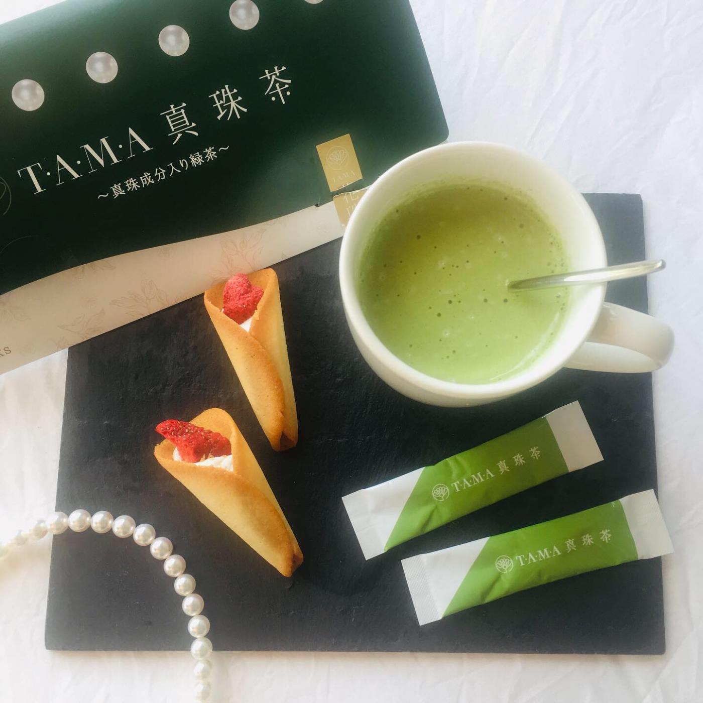 TAMA真珠茶は、真珠の粉と緑茶をブレンドした贅沢な健康茶です。