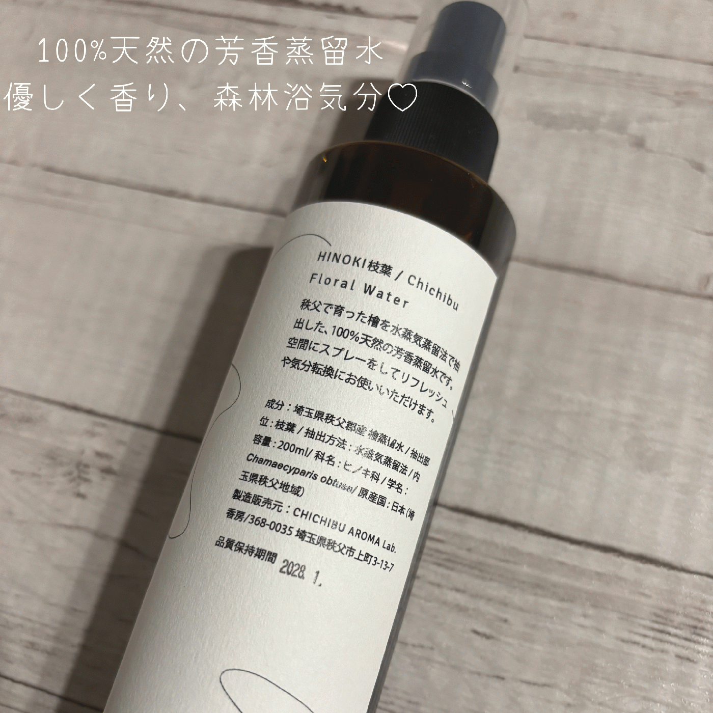 秩父で育ったヒノキの枝葉のみを、水蒸気蒸留法で丁寧に抽出した100%天然の芳香蒸留水。