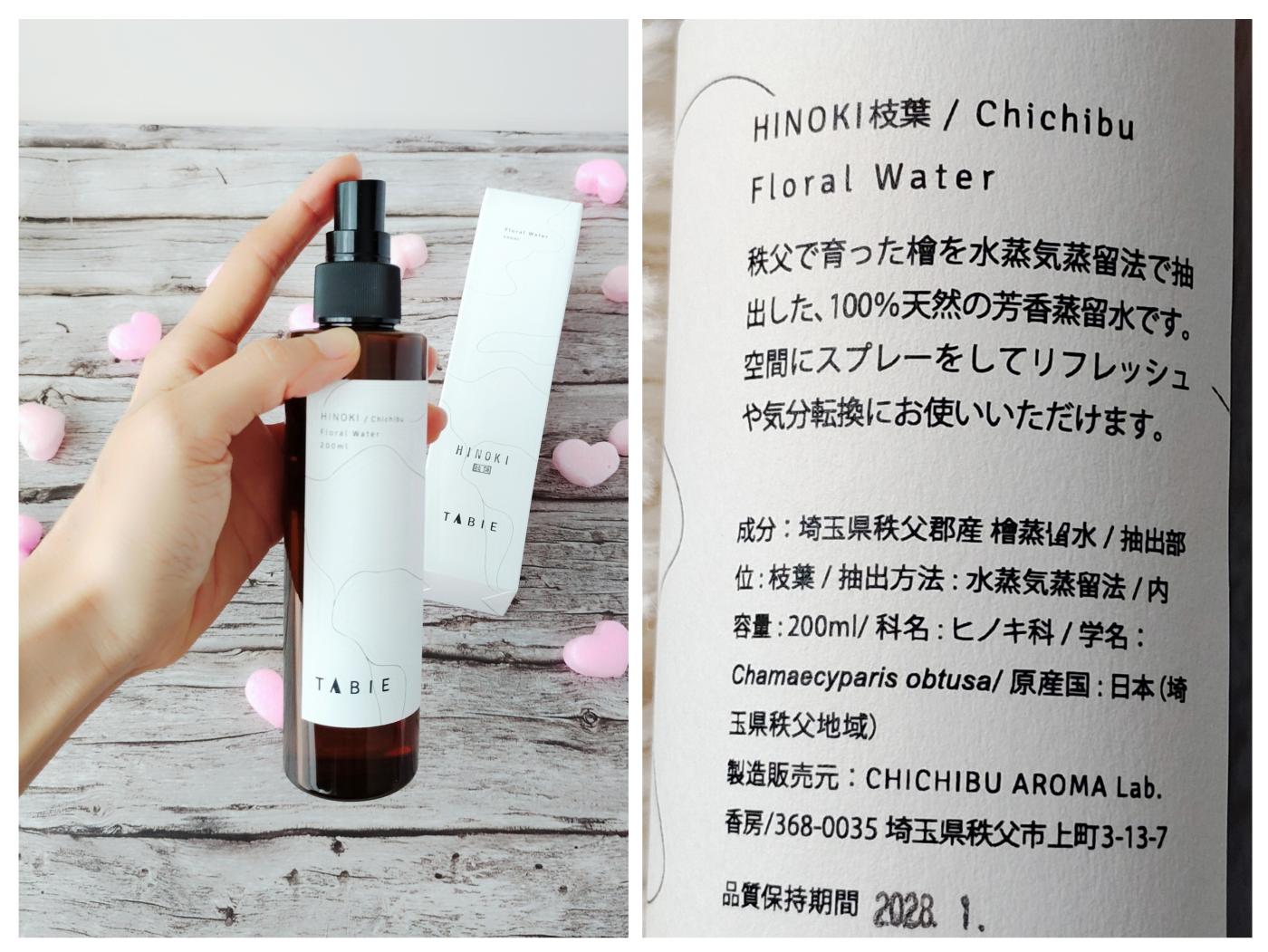 コエタスのモニターキャンペーンでもらった TABIEさんの『HINOKI 枝葉 / Chichibu - Floral Water』に...