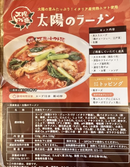 「太陽のトマトラーメン」を提供していただきました。 リコピンはトマト3個分だそうです。 一般的な...