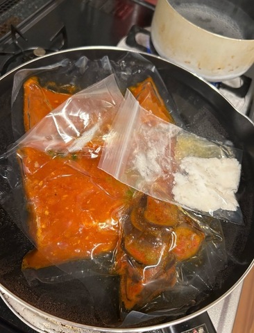 また具材入りのスープ、ナス、ニンニク、背脂、海苔パウチに別々に