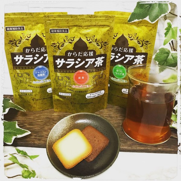 サラシア茶の「紅茶」と「ほうじハトムギ茶」と「ジャスミン烏龍茶」をいただきました。 サラシアと...