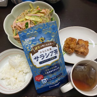 食前に飲むことで糖分の吸収を抑えたり、血糖値の上昇を抑えてくれる効果のあるというサラシアが含まれたお茶をお試しさせていただきました。