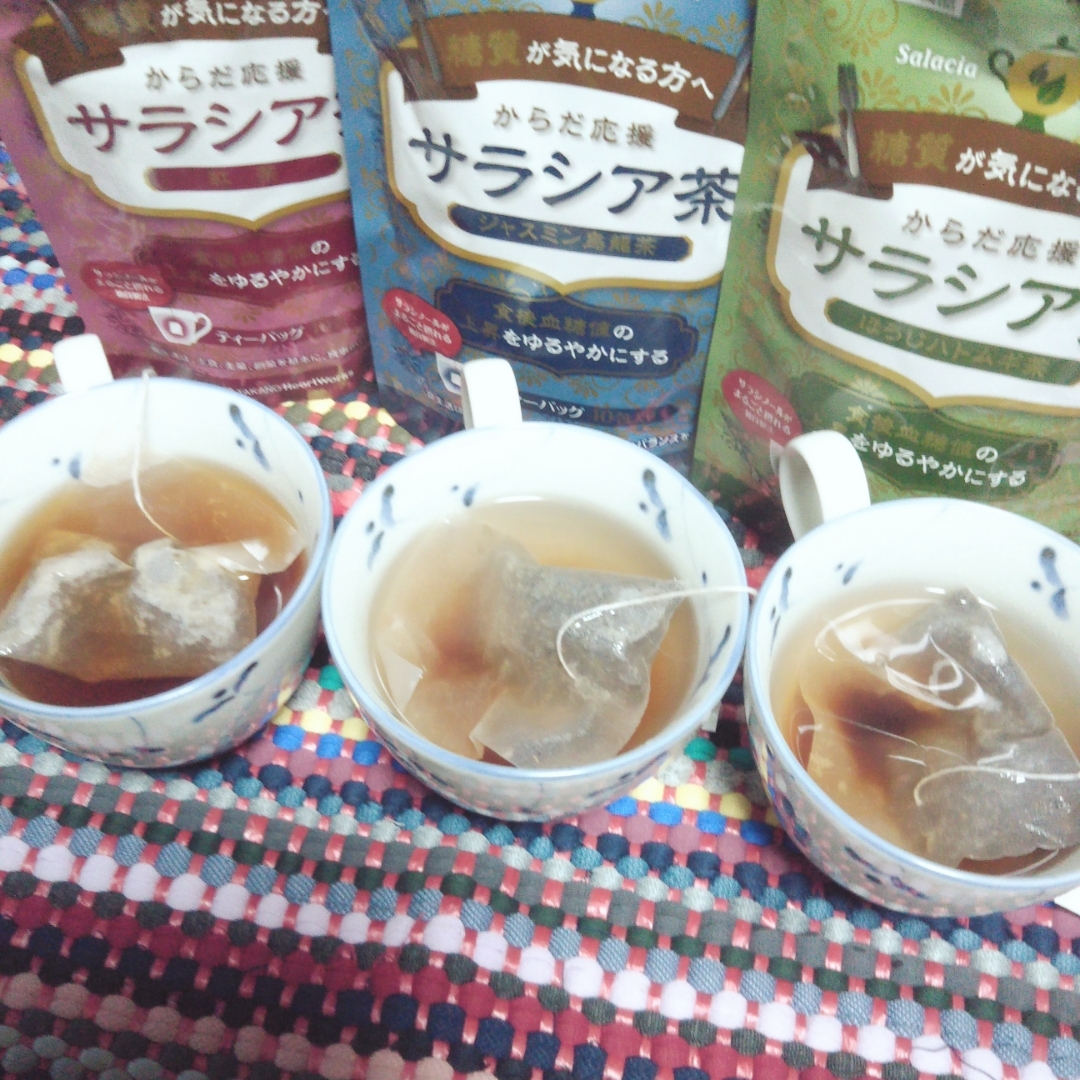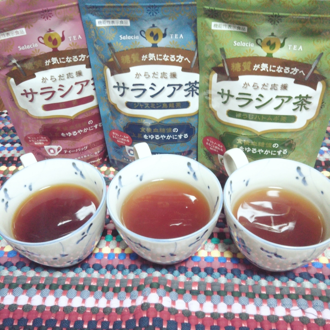 青がジャスミン烏龍茶、赤が紅茶、緑がほうじハトムギ茶の3種類です。デザインがおしゃれなチャック付きの袋タイプで色分けで味もわかりやすいです。紐付きのティーバックタイプになってます。ティーバックが大きめサイズ。マグカップで手軽に美味しいサラシア茶が作れます。サラシアエキスが顆粒状でティーバッグに入っているので、サラシアそのものを摂ることが出来ます。早速3種飲み比べしてみました。香りはそれぞれいい香りでジャスミンの香りがすごく癒されます。それぞれお湯を注ぐとあっという間に色が付き、香りも引き立ち、色味はさほど変わりはなしです。紅茶がやや濃いめな色かな。苦味や渋みなどは全然なくて飲みやすいし美味しい!健康茶という感覚がないです。あっさり、さっぱり系でホッとできる。私のお気に入りはジャスミン烏龍茶です。香りにも味にも癒されます。便秘も悩みな私。その日の気分で味を変えて飲んでいます。飲み始めてからお通じが良くなってて驚き。サラシアは、食事の際の糖質吸収を穏やかにしてくれるので食前に飲むのが理想的なので朝は子供の起きる前に癒されながらゆっくり味わっています。食事との相性もいいので、和洋中とそれぞれの食事に合わせてよりおいしく飲むこともできて、毎日続けられてます。美味しくないと続かない!味に飽きがち!という方にもすごくおススメです。糖が気になる方だけでなく、ダイエット中の方、ダイエットはじめる方にもピッタリです。毎日飲んで健康なからだに♪