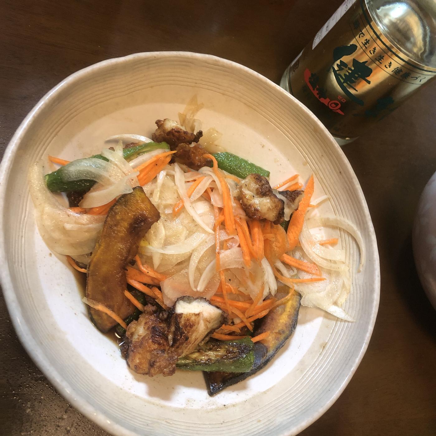 揚げたお肉やお魚野菜などと千切り玉ねぎ・人参と一緒に