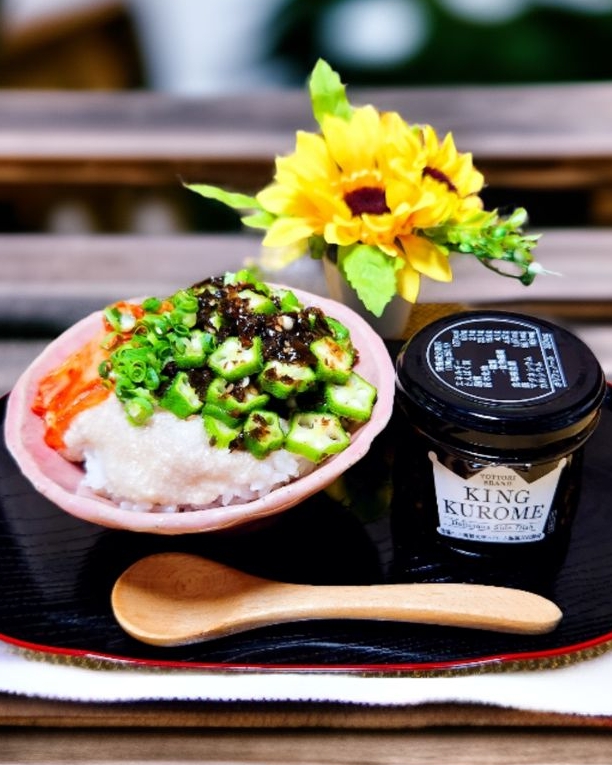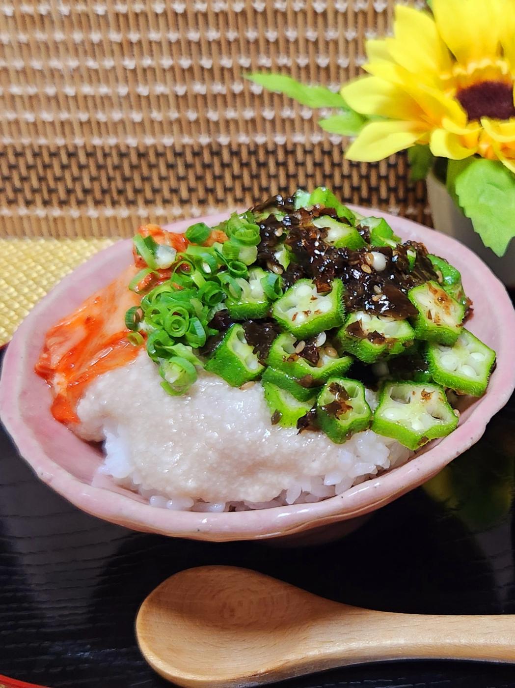 刻んだオクラに「キングクロメ」を和えて、とろろ、キムチ、ネギとご飯にのせれば出来上がり🙌