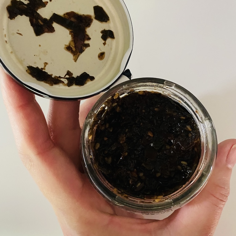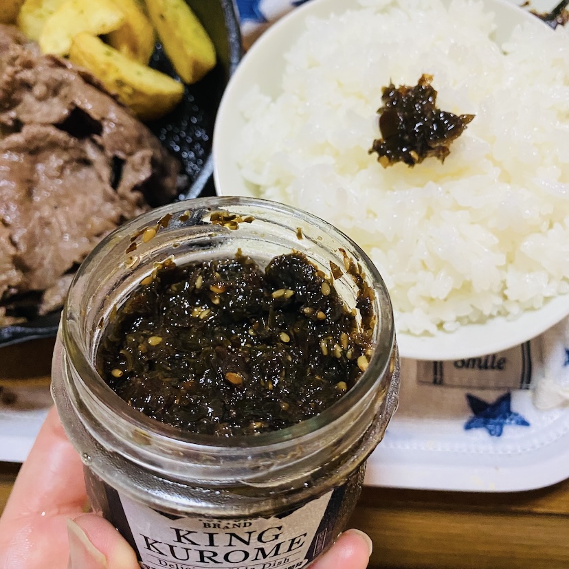 KING KUROME(キング クロメ)の見た目は海苔の佃煮っぽいです。瓶を開けるとほのかに海藻の香り。「クロメ」は程よいザグザグとした刻み方がされていて、口の中で少しコリコリとした食感と、