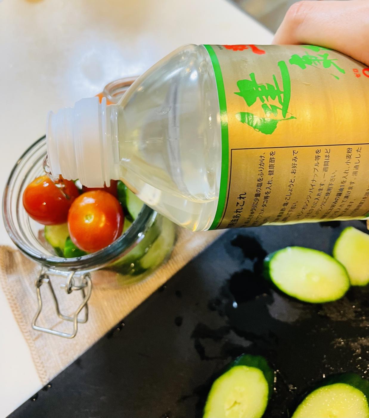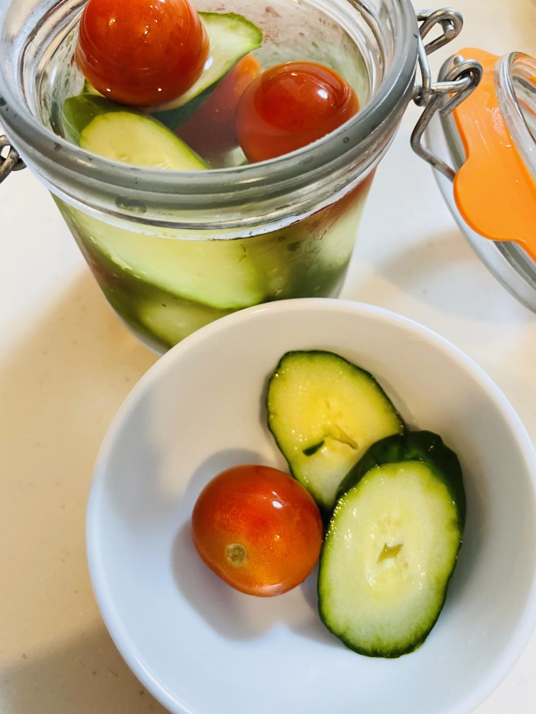 ビンに、斜め切りにしたきゅうり1本とミニトマトを入れます。そして、この健康酢を野菜が浸るくらい入れ、冷蔵庫へ。