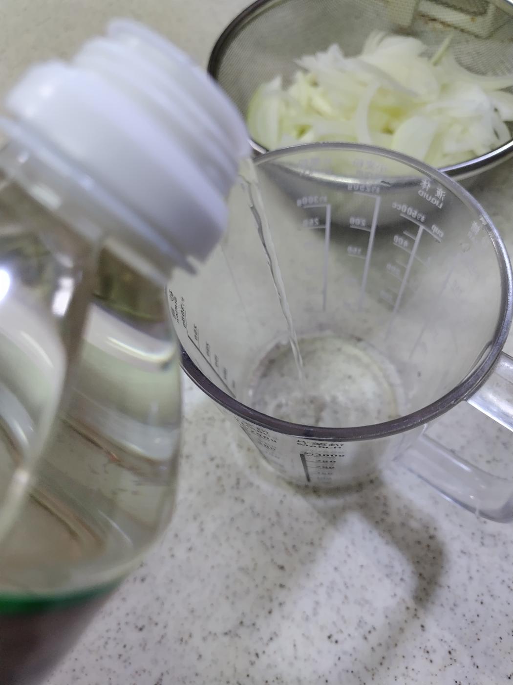 酢を100ml、お鍋に沸騰させて、刻んだ玉ねぎ一玉分を煮込みます。