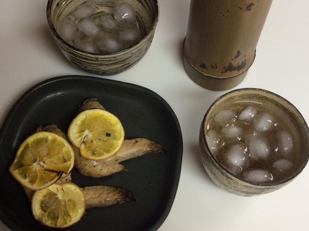 竹の節の部分に穴をあけ、アルコール度数20なので氷を多めに入れ飲んでみたんだ〜♪