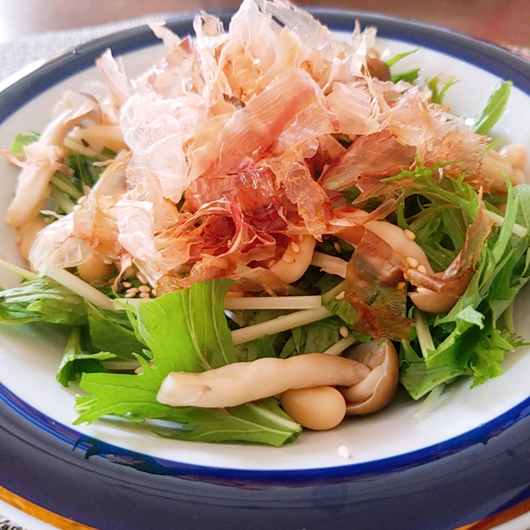 今日の夜ご飯のサラダ☆水菜とレタスとキノコと大豆の簡単サラダが鰹節をたっぷり乗せると何だかボリュームアップ♡ドレッシングも少量でオッケ〜