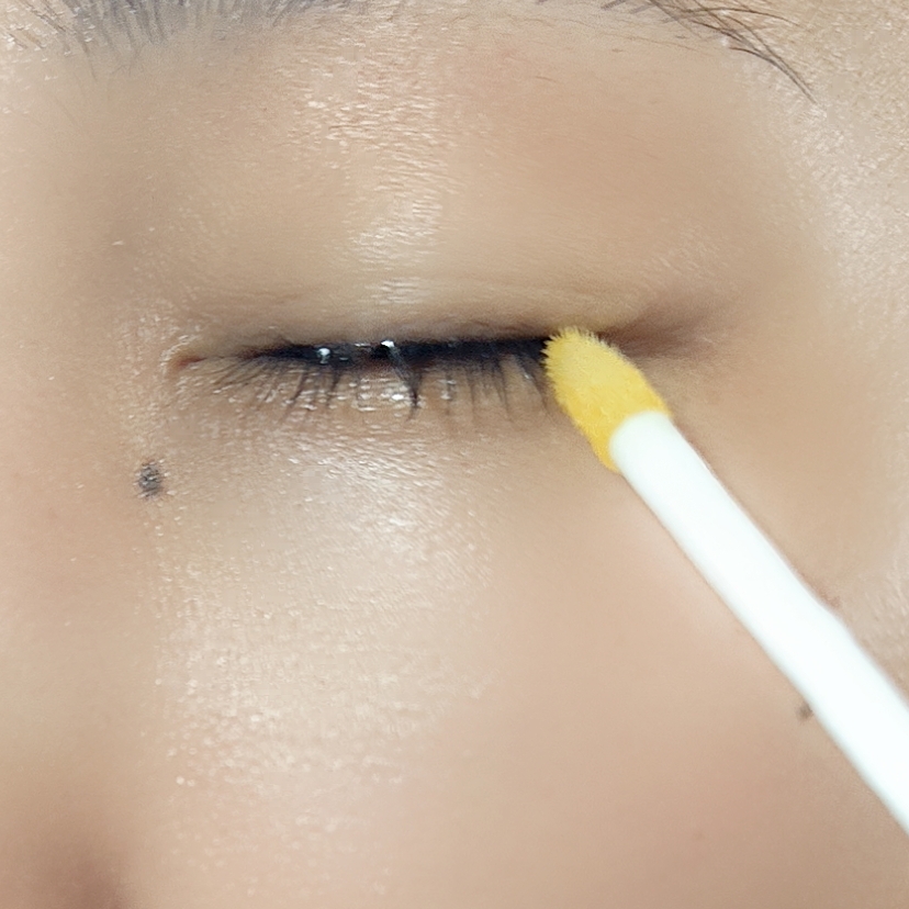 まつげの生え際とまつ毛、まぶたに塗布するだけ。べちゃっとダマになりにくい液状なのでべたつき残りも気にならず◎。