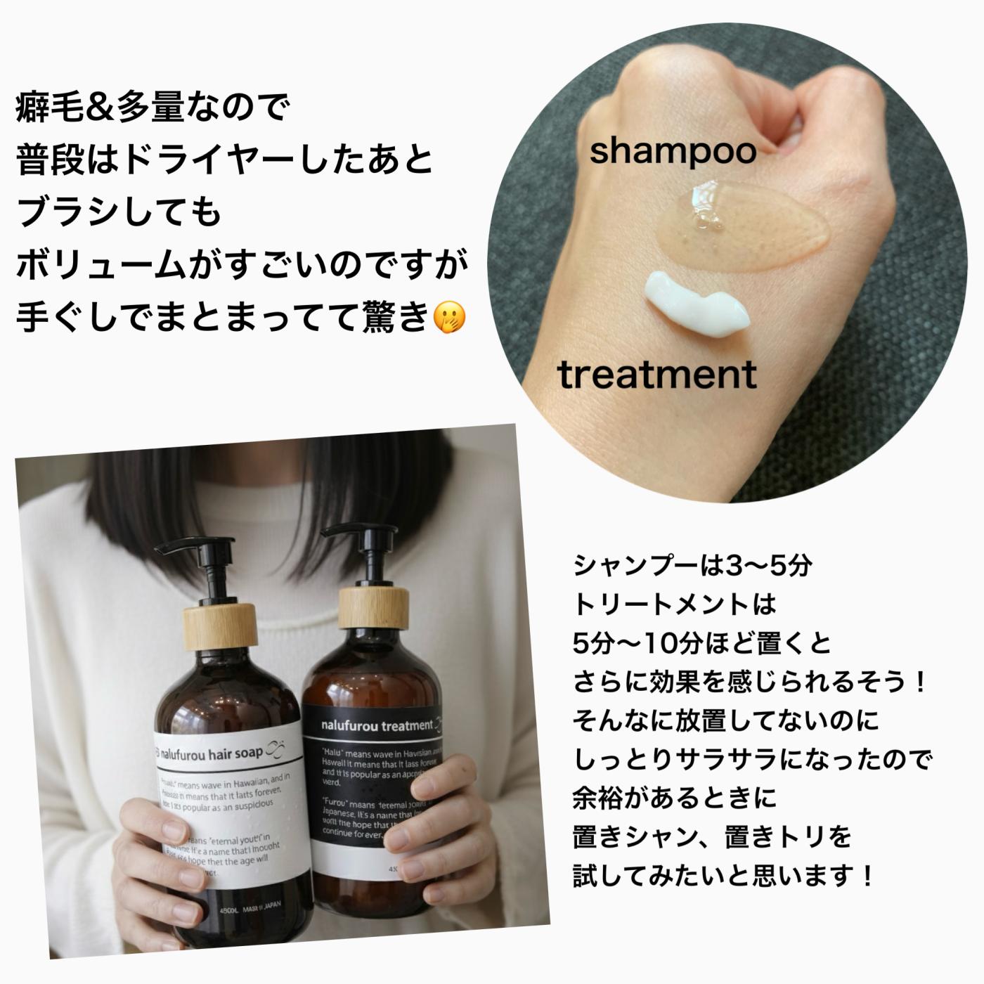 ノンシリコンって「キシキシしそう」なイメージだったけど、Nalufurouは全然違った!洗い流すときから指通りが良くて、ドライヤー後もしっとりなめらかな仕上がりに。いつもはボリュームすごくなるのに落ち着いてたのも好印象♡