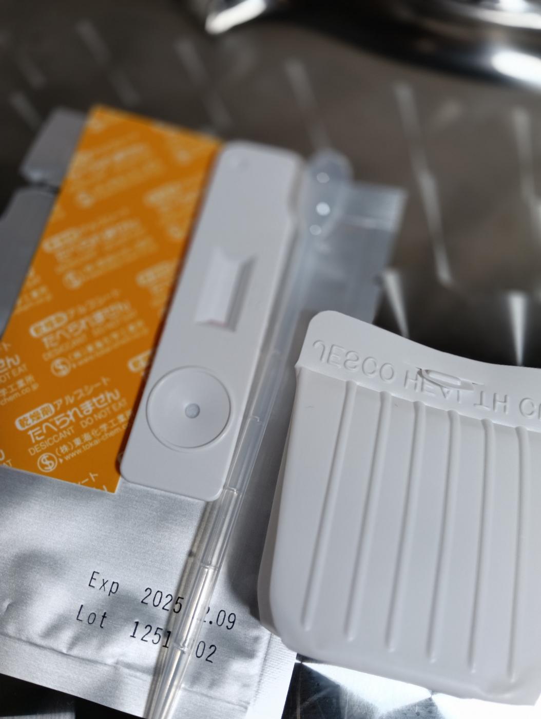 キットの内容はシンプル。カップ、スポイト、カード型の試験試薬、説明書。試薬は乾燥剤とともに包装され、使用期限も記載されています。