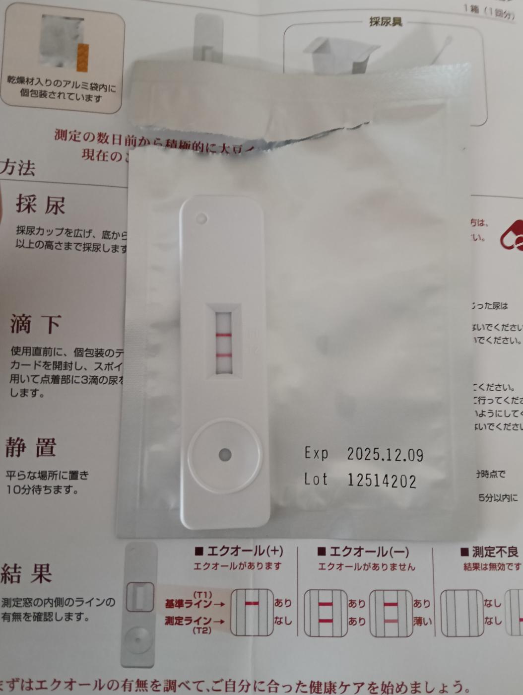 エクオールという言葉をここ数年でよく聞くようになりました。このキットの説明書をみて始めて、イソフラボンが腸内細菌によって代謝され、エクオールが産生されるということを知りました。この腸内細菌で代謝ができるのは日本人では約1/2の確率のようでふ。30歳を超えた方々に、是非時々チェックをして自分の体質を知って未来につなげてほしいです。