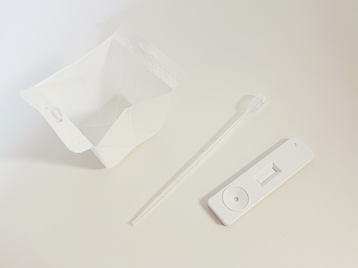 1箱1回分で取扱説明書とチャック付きパウチにテストカード、採尿スポイト、採尿カップが入っています。
