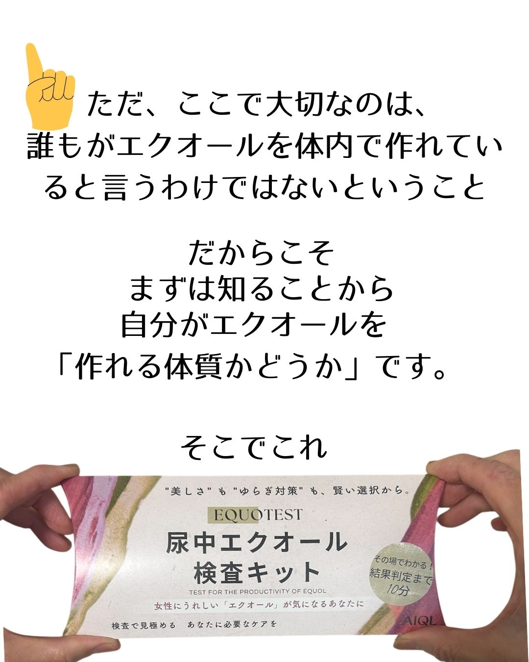 検査結果はすぐに確認でき、自分がエクオールを作れる体質かどうかを知ることができます。これまで何となく選んでいた食事やサプリメントについても、「自分にはどうなのかな?」と考えるきっかけになりました。感覚だけで判断するのではなく、こうして客観的に自分の状態を知れることで、これからの体調管理を前向きに考えられるようになった気がします。