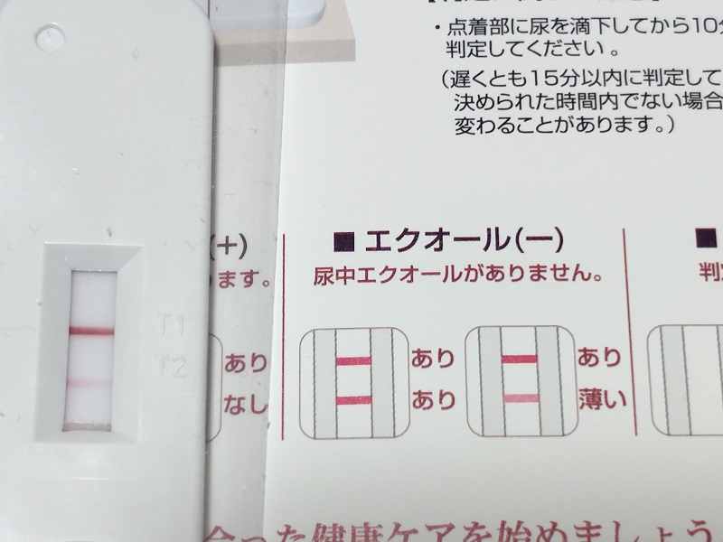 検査はとても簡単で、10分待つだけでその場で判定結果がわかります。採尿から検査完了まで15分もかからず、そのうち10分は放置時間なので本当に簡単でした。