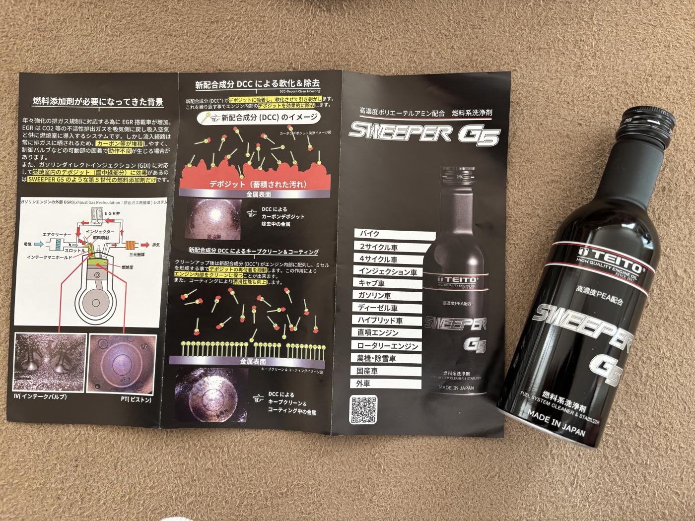 高濃度ポリエーテルアミン配合の燃料系洗浄剤SWEEPER G5は、バイク・ガソリン車、ハイブリッド車、外車等さまざまな車に対応可能です。