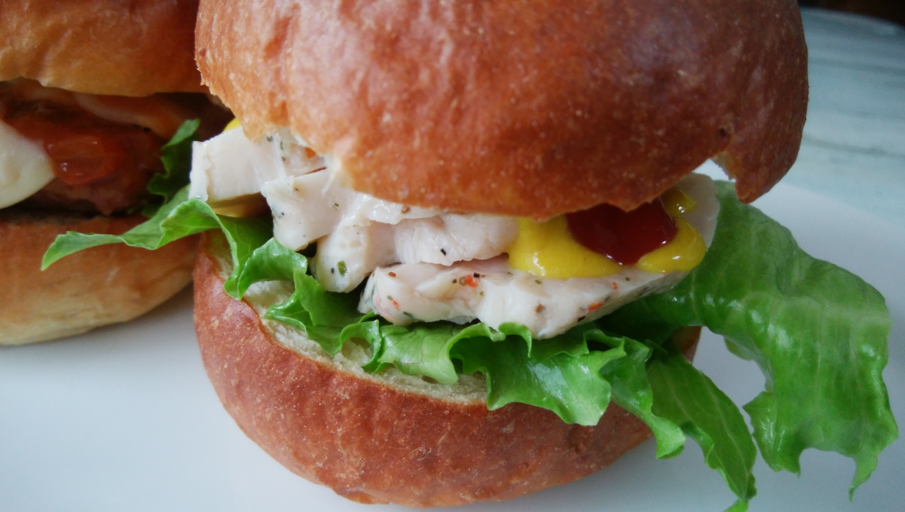 ハンバーグとチーズ、バジルのサラダチキンを挟んで作りました。