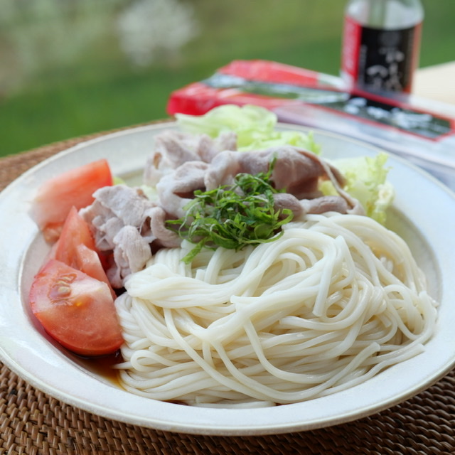 質の高い手延麺を作るには、グルテン量と質が麺づくりに適したオーストラリア産の小麦を使うのが一般的だそうですが、厳選された国内産100%の小麦・塩・食用油のみを使用し熟練の職人さんたちによって作られたものだそうです。のびにくい麺とのことで今回は冷しゃぶサラダを添えていただきました。つるつるでもっちりした食感がとても美味しかったです。