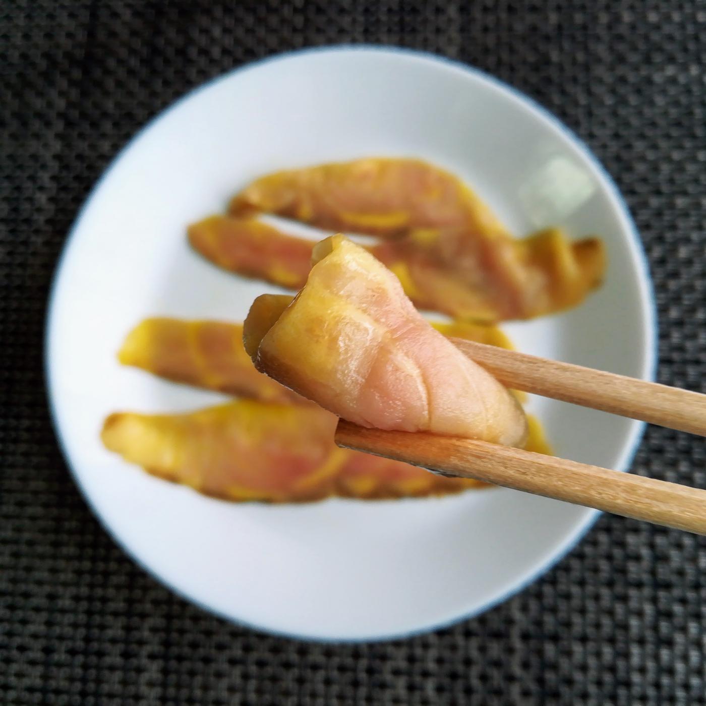 さっそく封を開けると・・・薄くスライスされた冷燻スモークがパック詰めされて、二人の晩酌でちょうど消費できそうな量。冷燻スモーク自体はかなりオイリーですね。パック袋やトレイ、指先もベッタベタ。いや~これはスモークサーモンより脂っぽいかも。白身の魚なので、もっとあっさりとした淡泊なイメージだったんですが全然違ってました。あと匂いもちょっとクセがあります。少し生臭い感じ。。。味覚に関しては個人的な主観でしか語れないので、少し厳しめの評価になってしまうのですが、わたしの好みではなかったです。もともと大トロやブリなどの脂がのった系の刺身が苦手なタイプだからかもしれません。この「チョウザメ冷燻スモーク」はマリネにしてもオイリーで生臭さも残り、最後は火を通してみたのですが、それでも独特のクセは消えてくれなくて。。。しかも加熱したらめちゃくちゃ縮んでしまった(泣)