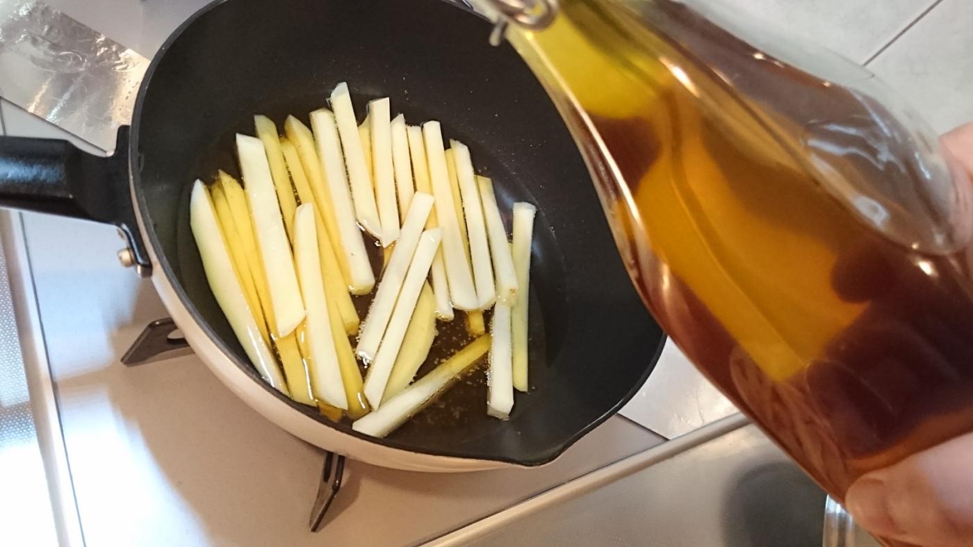 まずはジャガイモをやや細目にカットしてフライパンに入れます。