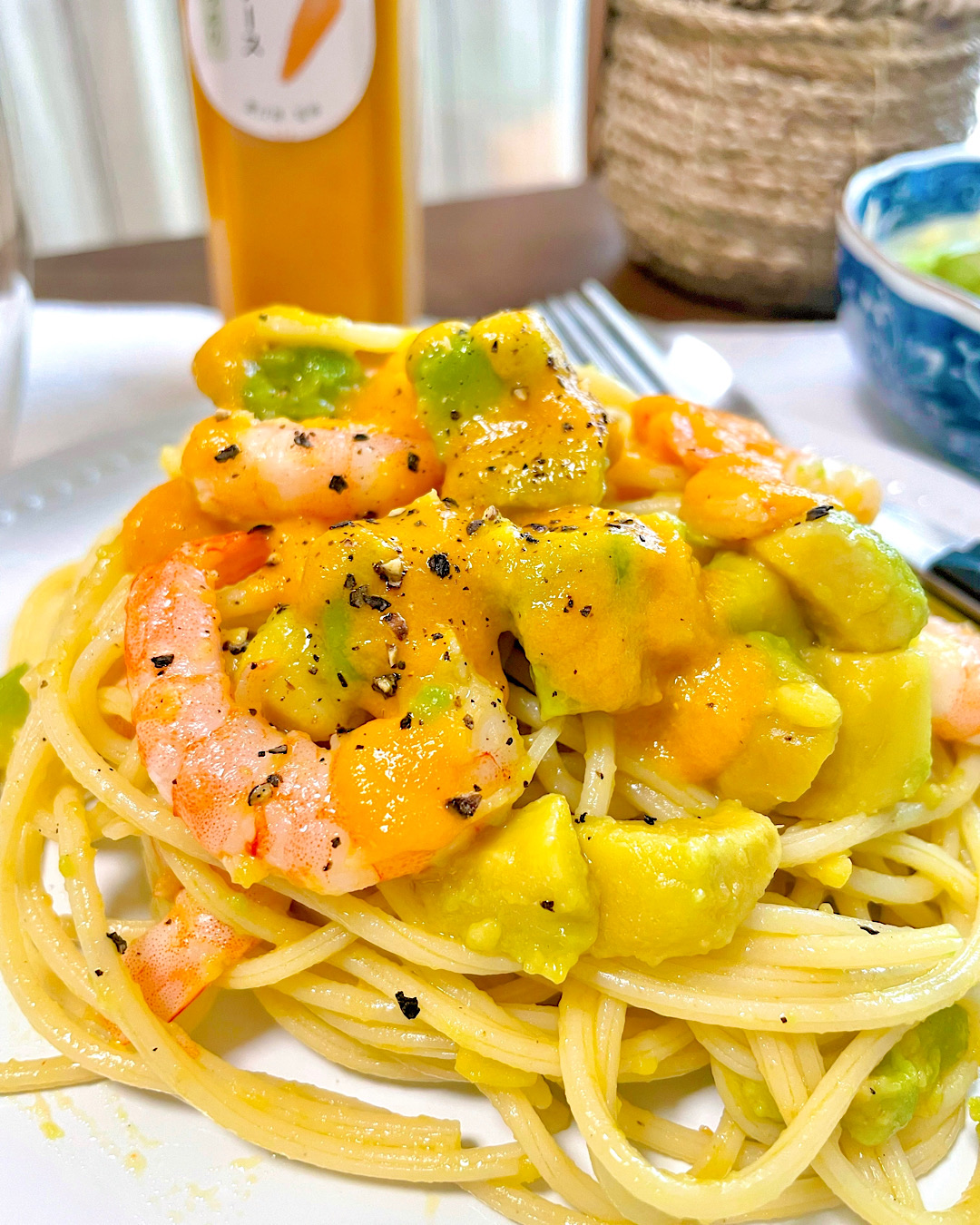 ちょうど冷凍庫に入っていたサラダえびとアボカドダイスカットを使ってスパゲッティと絡めてみました。