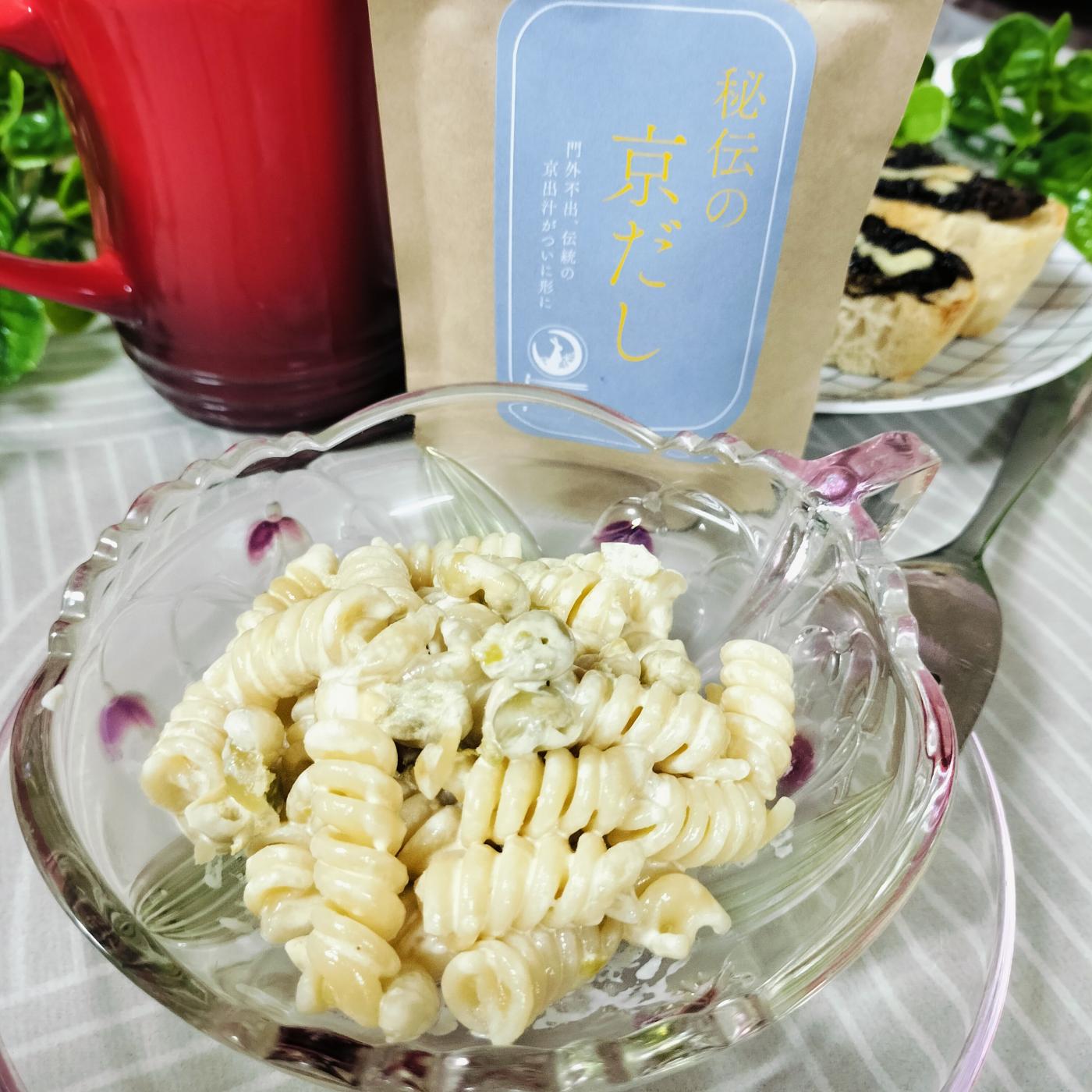 ゆでたマカロニと青豆に、マヨネーズと秘伝京だしを加えて混ぜ混ぜ♪