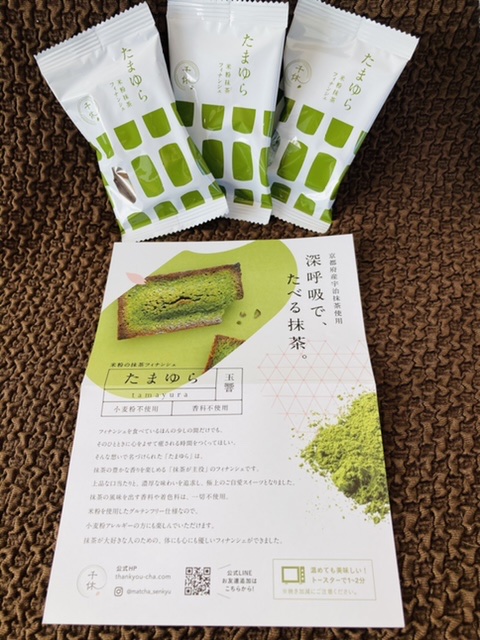 千休様より米粉の抹茶フィナンシェ(たまゆら)をいただきました。 「深呼吸で、たべる抹茶」って何?と気...
