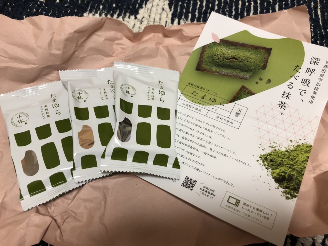 千休様より米粉の抹茶フィナンシェ(たまゆら)をいただきました。 「深呼吸で、たべる抹茶」って何?と気...