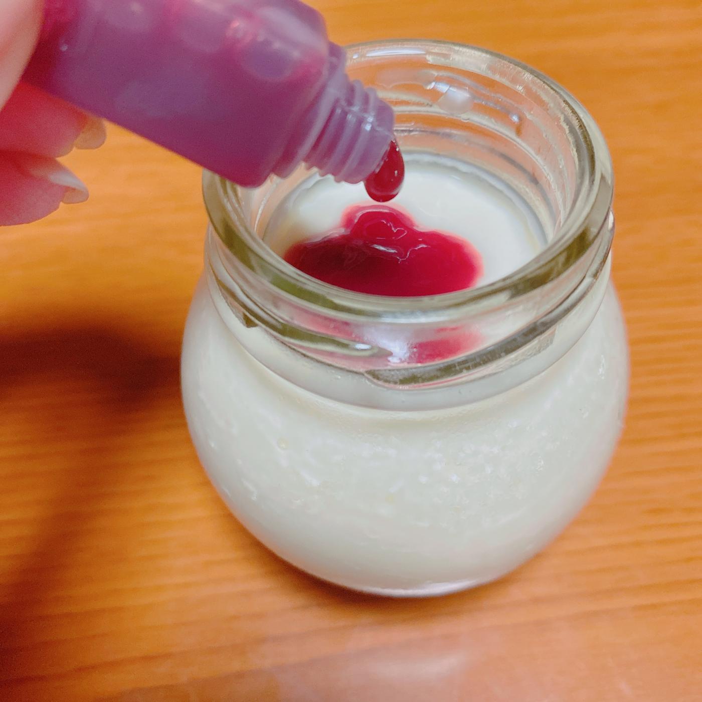 別添えのやまぶどうソースがついていて白いプリン の上に赤いソースをかけて頂きます。