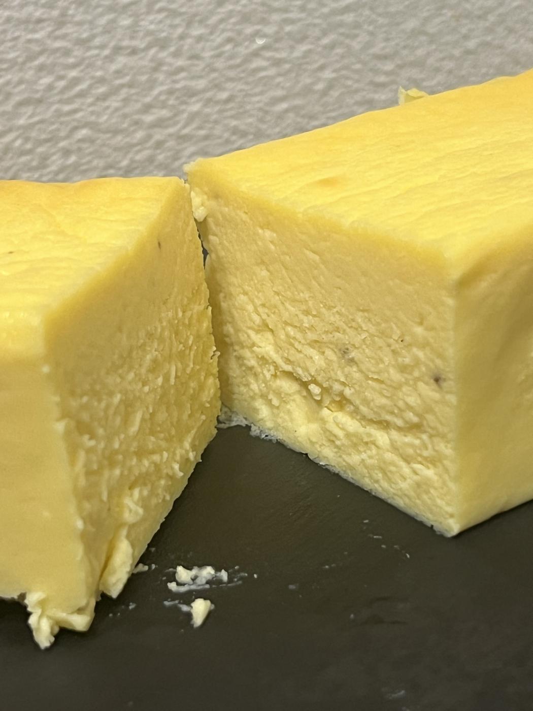 ウイスキーと一緒に楽しむことを前提に作られた、珍しいタイプのチーズケーキとのことで、甘さ控えめ、しょっぱさの効いた大人向けの味わいです。