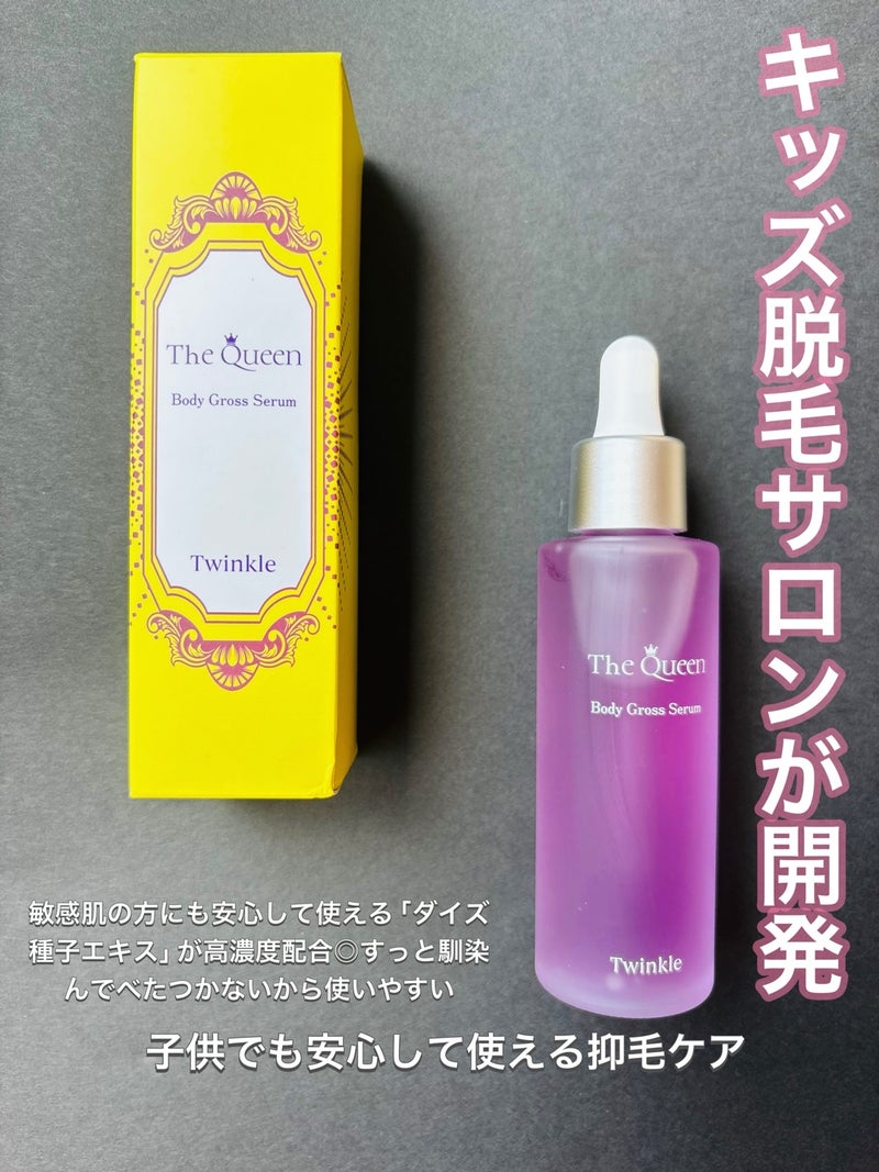【ボディグロスセラム】thequeen はキッズ脱毛サロン開発の抑毛セラムです。脱毛と併用すると脱毛効果がアップしますが、そのまま塗布することで、ムダ毛の成長を抑制する働きがあるというものです。敏感肌の人でも使うことができるようにダイズ種子エキスが高濃度配合されています。