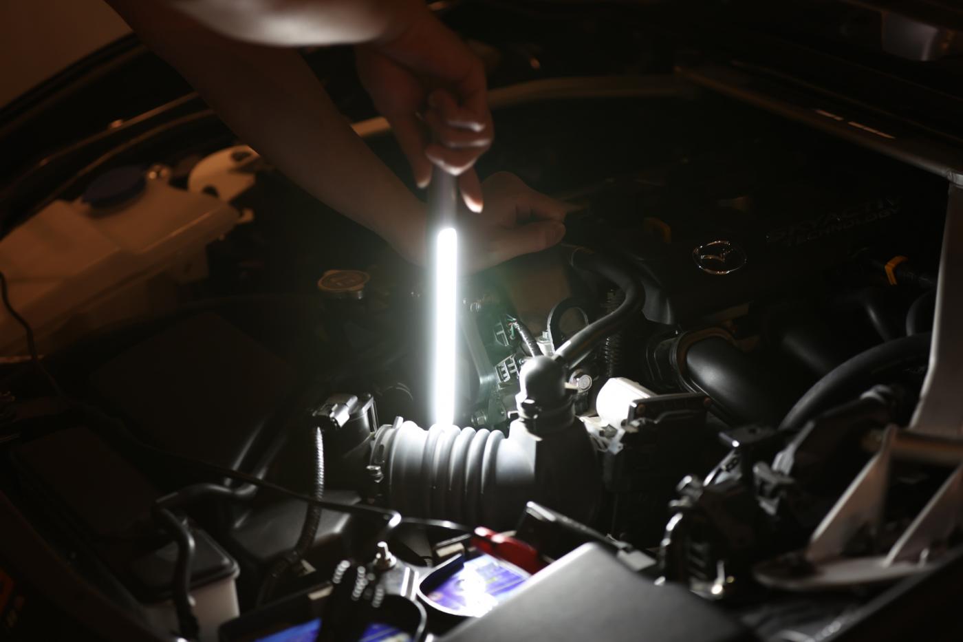 エンジンルームは複雑な形をしている上に、見るところも多いので、いろいろな方角から照らせて、とても便利そう