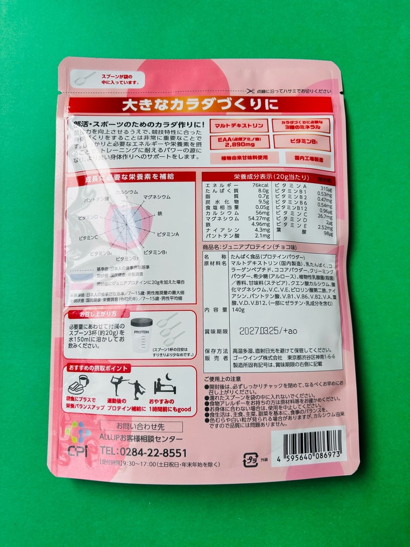 このALL UPジュニアプロテインは、目的別にいろんな味があって、娘がお試ししているチョコ味は大きなカラダづくりに最適になっているようです。