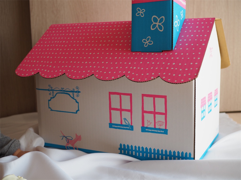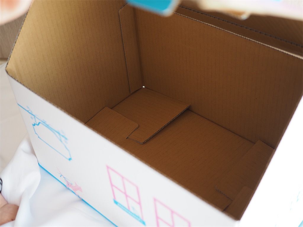 おうち型ボックスを出したところ最初はおもちゃだと思って喜び、実際にお人形を入れたりおうちに見立てたり、楽しんでいました。