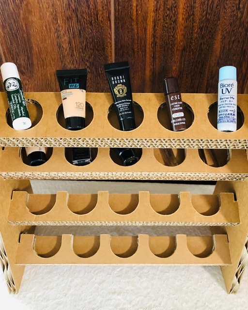 プラモデル等に使用する塗料のラックですが、小物などを種類ごとに、小分けにしておくのに便利そうだったので、ちょっとごちゃごちゃしていたメイク道具や、スキンケアのサンプル置きに使用させていただきました、今までサンプル品などは一つの引き出しに入れていたのですが、どれも小さいのと、サイズがバラバラなのできちんと整理するのが大変でした、ひとつひとつが小さい物を、分類して一目でわかるように並べるのが楽しかったですし、スッキリしました