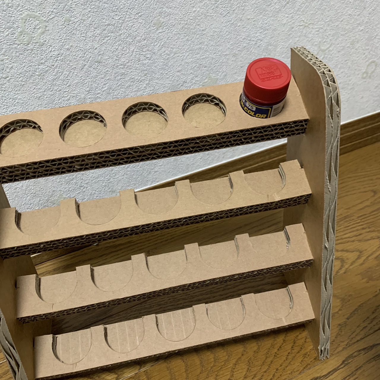 プラモデル等の塗料を置くために作られたダンボール製の塗料用ラックです。 ラックは4段で1段に5個、...