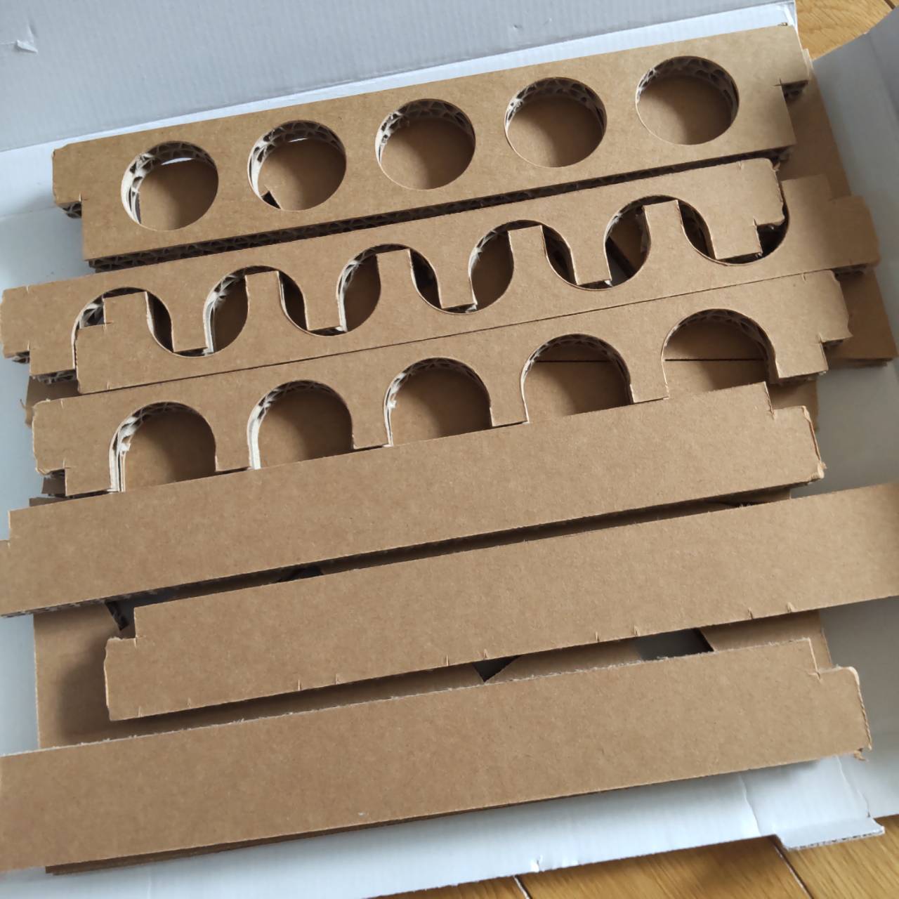 おうち時間も増え、プラモデル等が好きなパートナーの部屋を整理するために!…と思っていたら、段ボール製の塗料ラックに出会いました。耐水性のある強化段ボール製で、20個の塗料を並べることができます。届いたのは、ラックのキットで、自分で組み立てるようになっていました。パーツも10枚しかなく、組み立て方も分かりやすい説明書になっていたので、夏休みの工作の時間だ!、と夏休みで家にいる子どもと一緒に組み立ててみました。