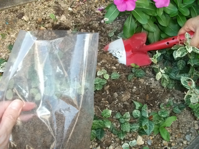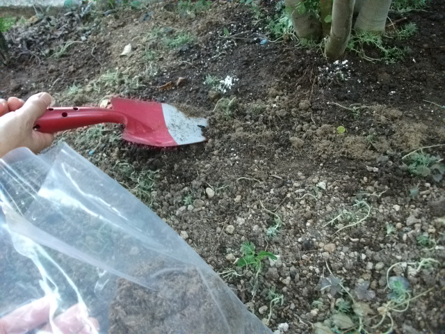ぱっと見た感じが土のように見える竹粉で早速、庭の植物を植えている複数の場所に使用してみました。植物を植えている場所の周囲にまいてスコップで混ぜ込みました。