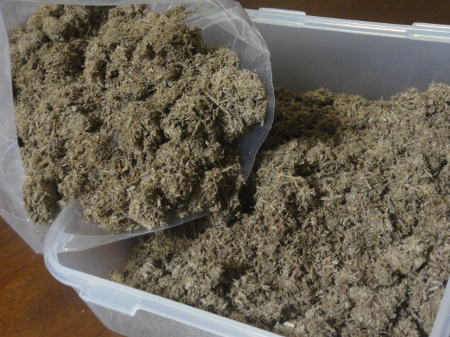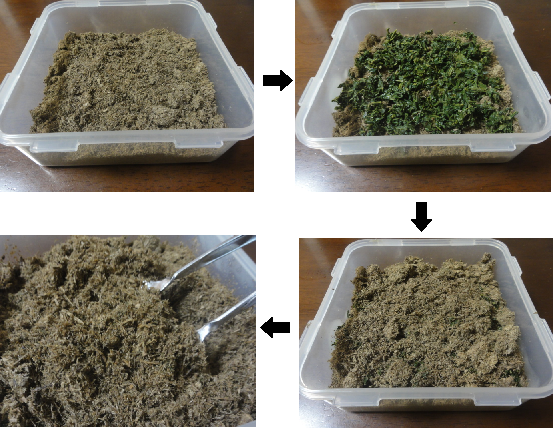 バケツやタッパーなどに発酵竹粉を半分ほど入れます。