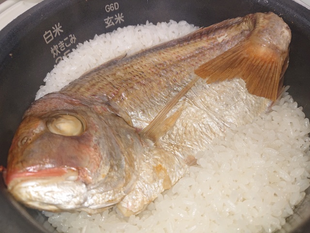 冷凍で届いた大きな鯛は解凍してからでないと、炊飯器の中に入れることができませんでした。