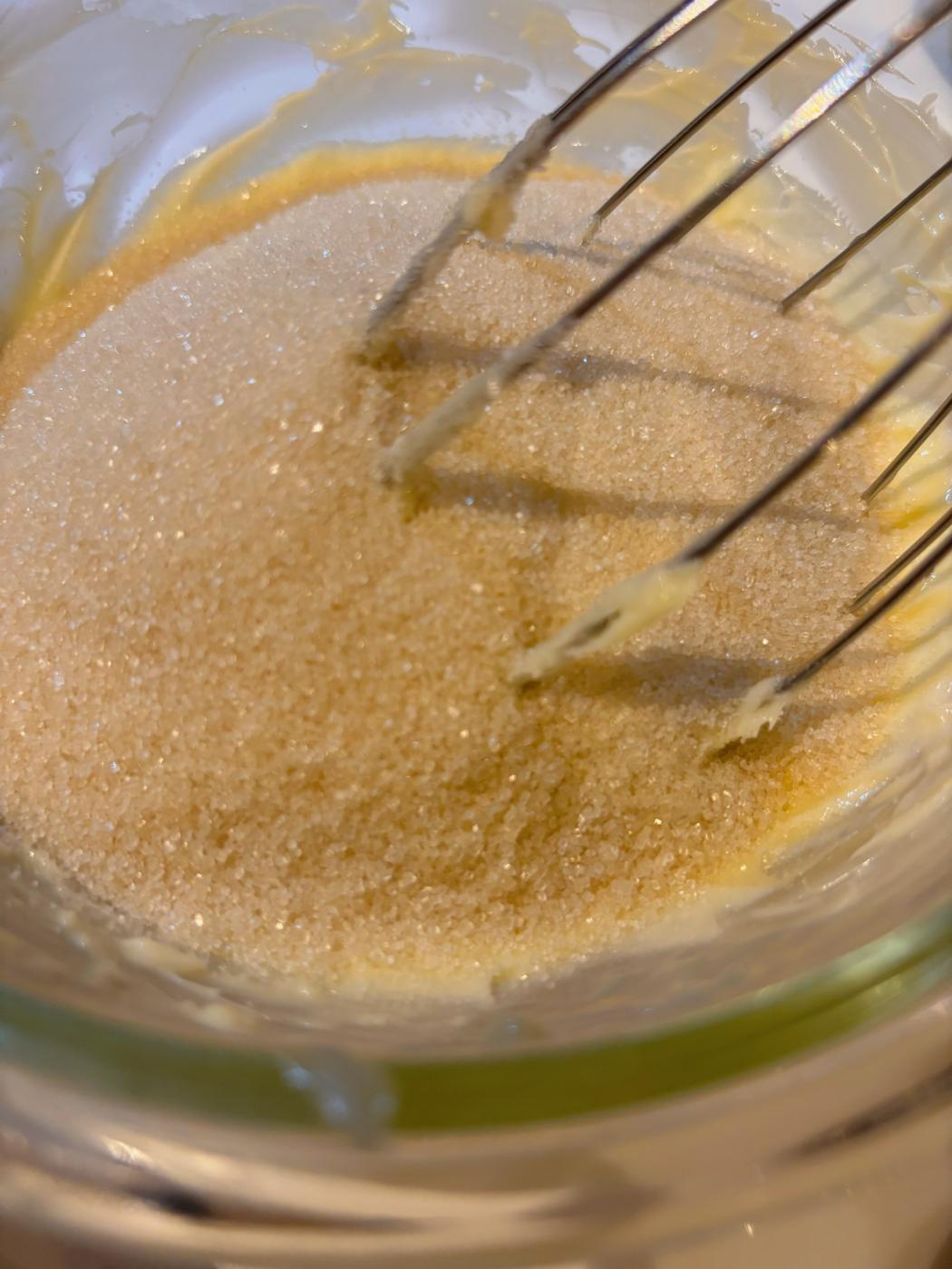 そこにお砂糖を入れて白っぽくなるまで混ぜて溶き卵を加えて混ぜる