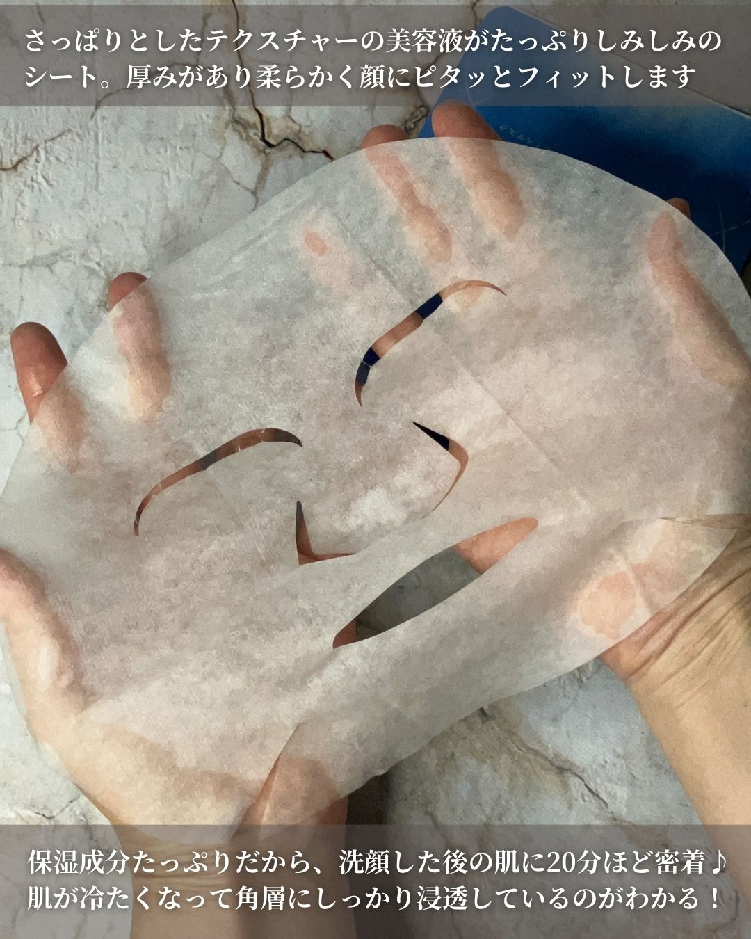 さっぱりとしたテクスチャーの美容液がたっぷりしみしみのシート。厚みがあり柔らかく顔にピタッとフィットします。