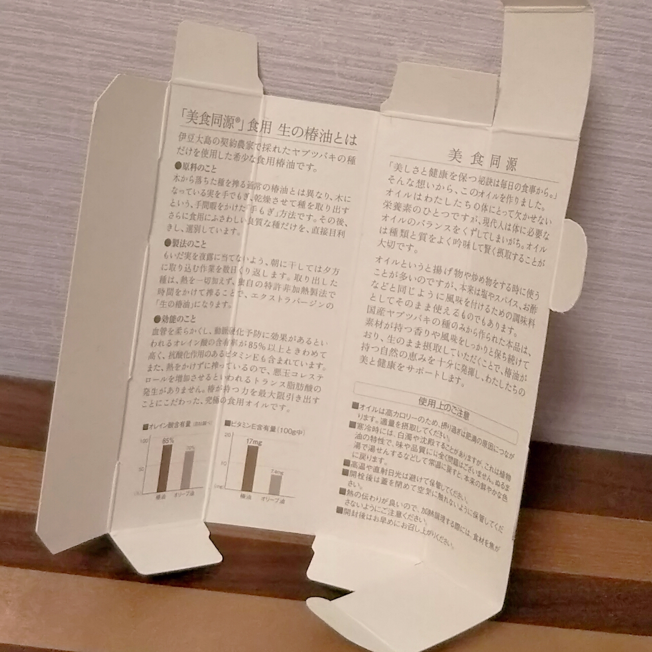椿油についての説明は外箱を開いた内側に丁寧に記されていました。