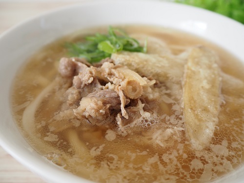 うちだ屋オリジナルの秘伝のスープ"うどんがえし(濃縮)"をベースに、ふんわりモチモチ食感の麺、牛肉玉葱入りと国産ごぼう天が三位一体となって織りなす博多を代表する逸品!