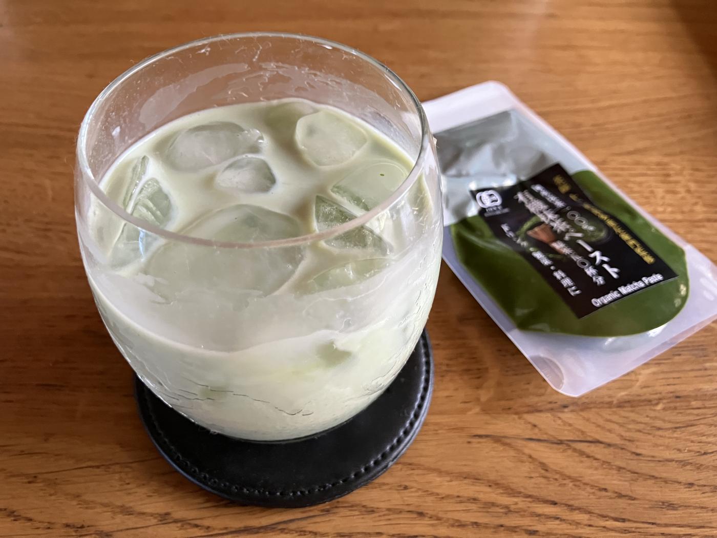 抹茶ペーストを小さじ2杯と同量の水、オリゴ糖を入れたグラスに牛乳120ccと氷を加えて混ぜるだけ。